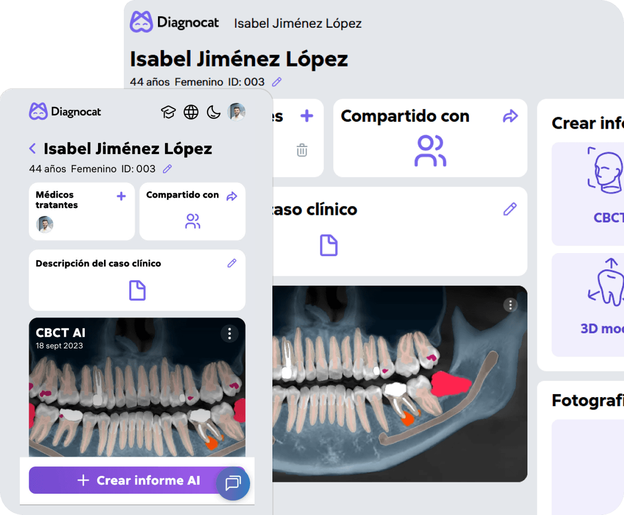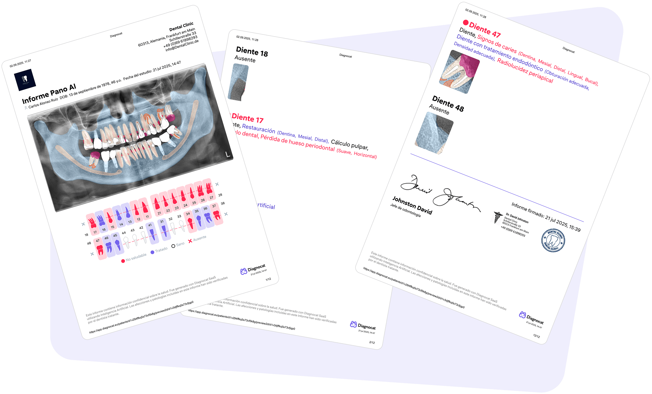 Diagnocat proporciona informes detallados de imágenes CBCT, panorámicas e intraorales. Estos informes visuales y comprensibles facilitan la comunicación con el paciente, disminuyen la ansiedad y fomentan la motivación para los tratamientos futuros.